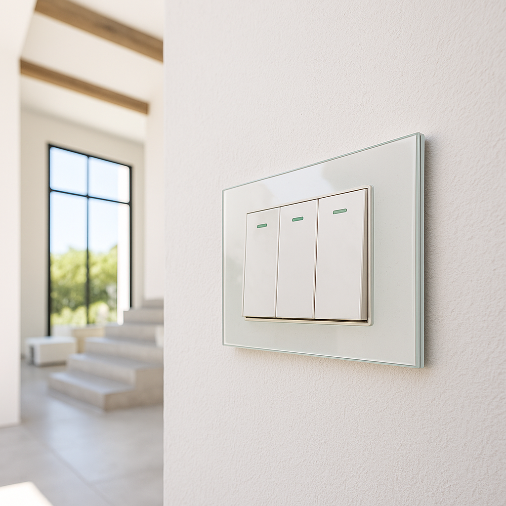 Placca a 3 posti realizzata in vetro temperato di alta qualità con finitura bianco opaco, pensata per dare un tocco di eleganza e luminosità agli interni. La superficie perfettamente liscia e brillante riflette la luce in modo naturale, creando un effetto premium che si adatta perfettamente sia agli ambienti moderni che a quelli classici. Compatibile con tutti i frutti modulari della “Serie Ginevra”.