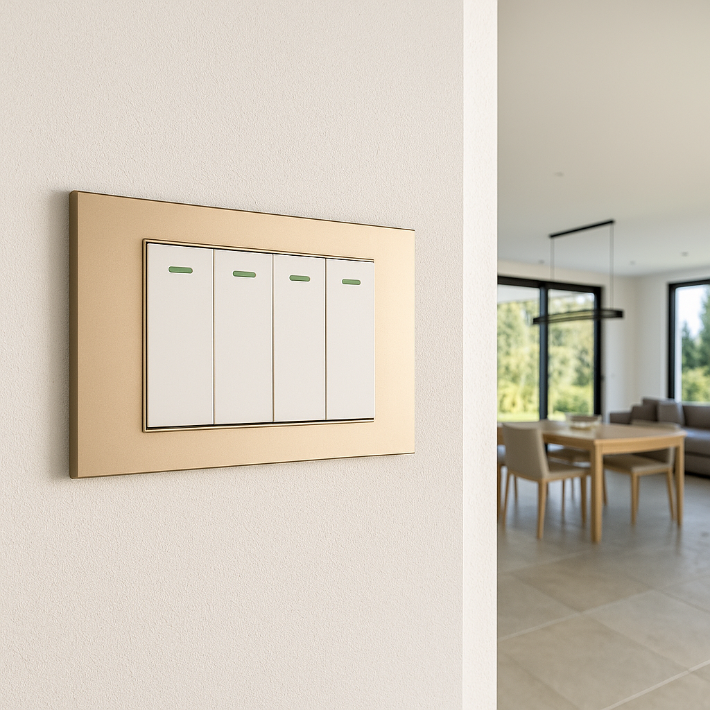 Placca a 4 posti in prestigiosa finitura oro satinato, realizzata in policarbonato autoestinguente V0 ad alta resistenza, progettata per unire eleganza, durabilità e sicurezza. La tonalità dorata, raffinata e senza eccessi, si abbina perfettamente a interni moderni e classici, offrendo un tocco di lusso discreto. Compatibile con tutti i frutti modulari della “Serie Ginevra” e ideale per installazioni di pregio in abitazioni, uffici e spazi commerciali.