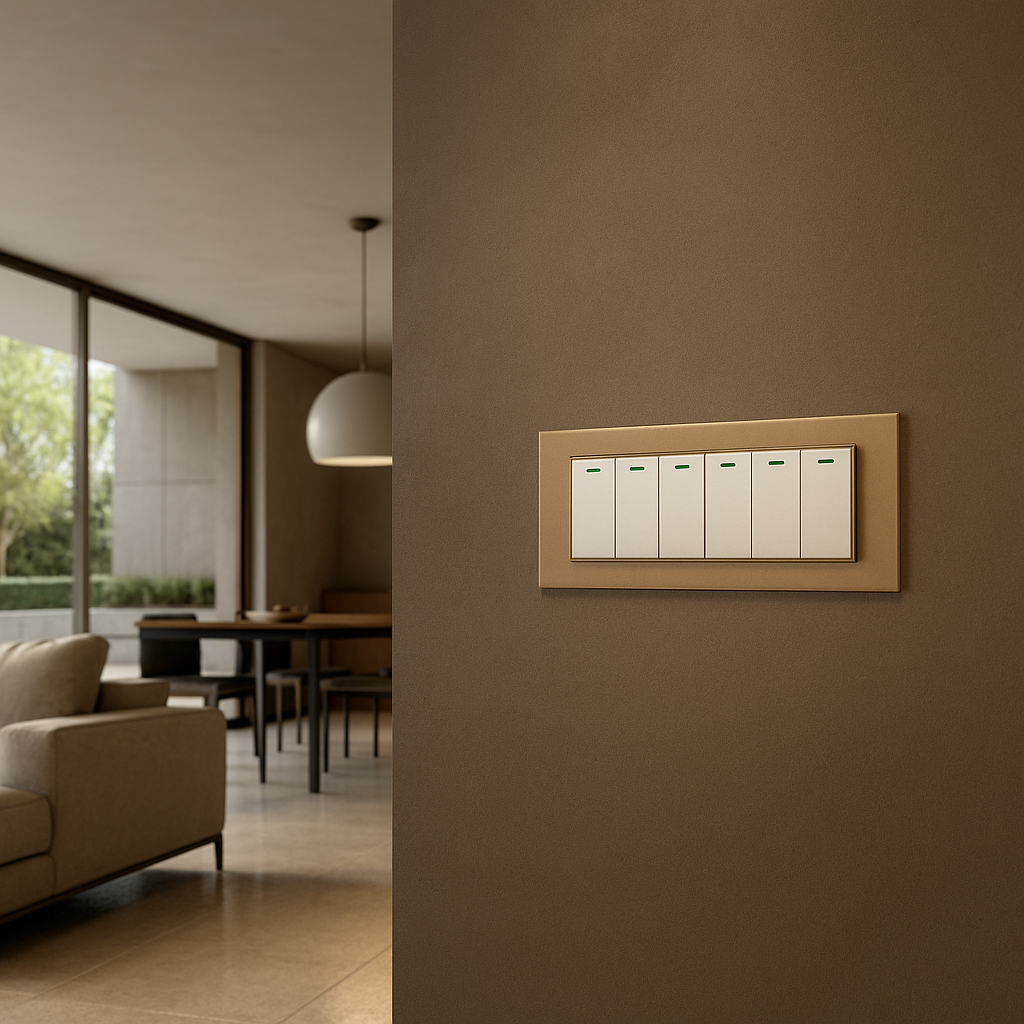 Placca a 6 posti in esclusiva finitura oro satinato, realizzata in policarbonato autoestinguente V0 ad alta resistenza meccanica, progettata per combinare lusso, funzionalità e durabilità. Il colore dorato, elegante e raffinato, valorizza qualsiasi ambiente, dal residenziale al professionale, aggiungendo un tocco di classe e prestigio. Compatibile con tutti i frutti modulari della “Serie Ginevra”.