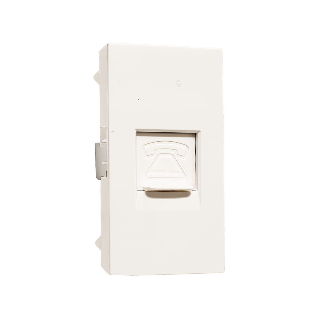 Connettore RJ11 telefonico a 1 modulo (1M) in finitura bianco opaco, progettato per collegamenti telefonici e trasmissione voce in impianti residenziali e professionali. Compatibile con linee analogiche e digitali, garantisce una connessione stabile e un’installazione semplice grazie al sistema di terminazione rapida.