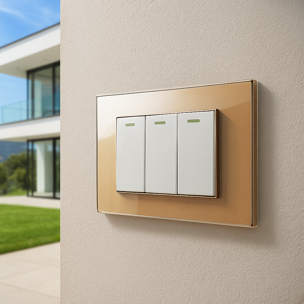 Placca a 3 posti in vetro temperato di alta qualità con finitura oro lucido, pensata per dare un tocco di eleganza e prestigio agli interni. La superficie riflettente e brillante esalta ogni ambiente, rendendolo più luminoso e sofisticato. Compatibile con tutti i frutti modulari della “Serie Ginevra”.