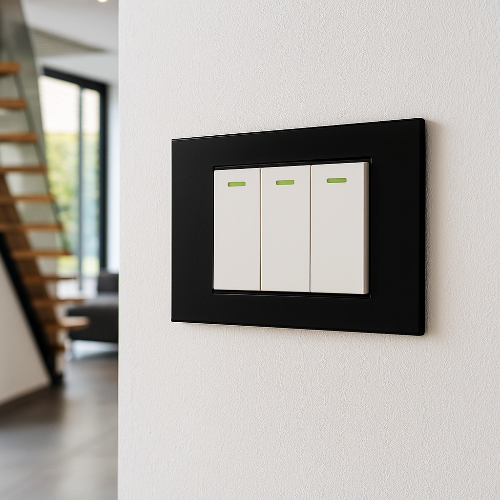 Placca a 3 posti in finitura nero opaco, realizzata in policarbonato autoestinguente V0, resistente a urti, graffi e raggi UV. Il design minimale e moderno, con profilo sottile e linee pulite, dona un tocco di eleganza e carattere a qualsiasi ambiente. Compatibile con tutti i frutti modulari della “Serie Ginevra”, è ideale per applicazioni residenziali e professionali. Incluso gratuitamente: supporto dedicato e kit di viti per il montaggio.
